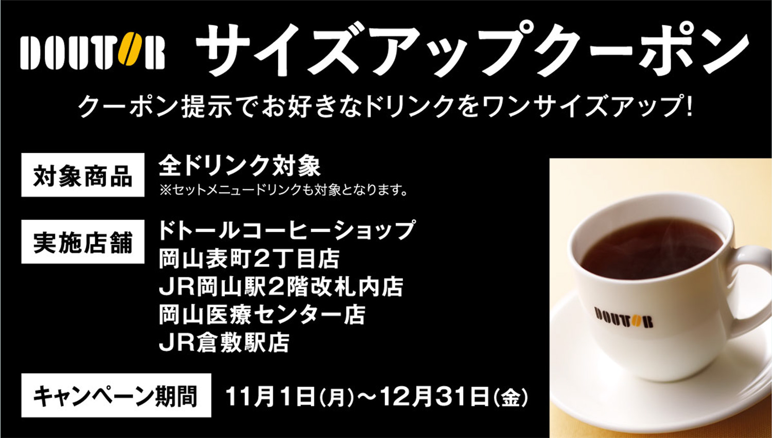 渋滞緩和・環境改善にご協力いただける方に、ドトールコーヒーの「ドリンクワンサイズアップ」の無料割引(クーポン)を提供いたします。