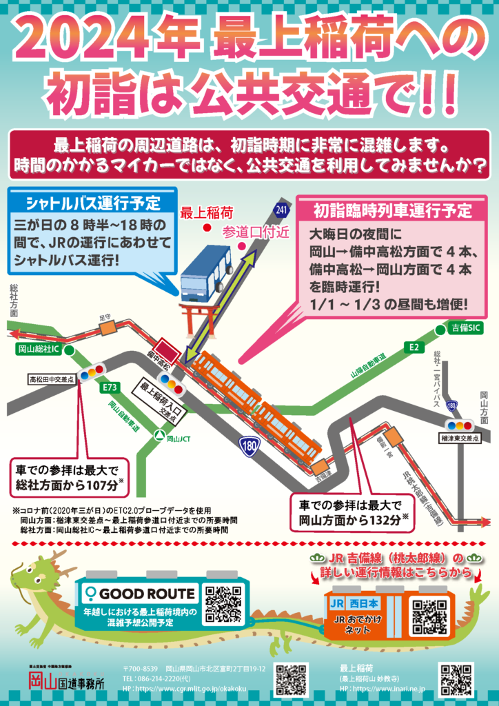 公共交通での移動が難しく、車で移動する場合には、早島IC・玉島ICを利用しましょう。