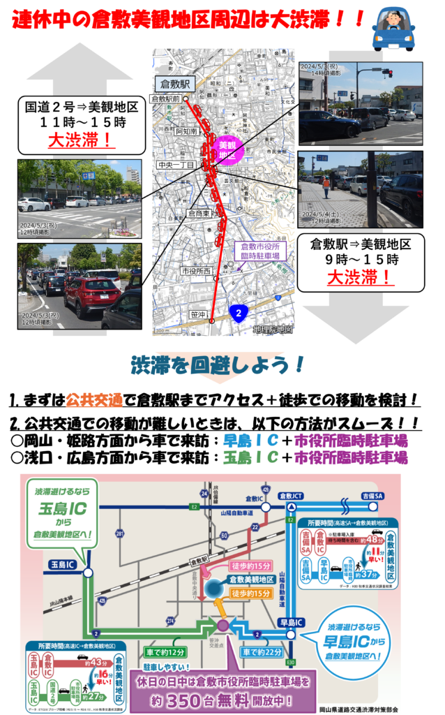 美観地区周辺の駐車場は、連休中は非常に混雑し、日中は入庫に時間がかかることが想定されます。