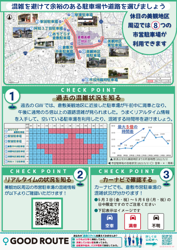 美観地区周辺の駐車場は、連休中は非常に混雑し、日中は入庫に時間がかかることが想定されます。