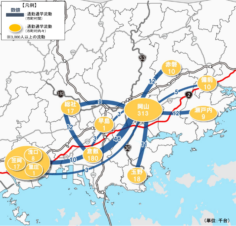 岡山市を中心とした通勤や通学の状況は、岡山市と倉敷市間の移動が多いです。