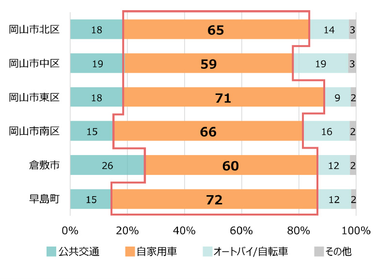 通勤や通学でのクルマ(自家用車)の利用率は約6〜7割と高くなっています。