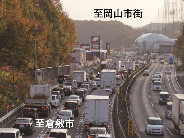 実際平日の朝は、岡山市と倉敷市を結ぶ国道2号では、常に渋滞が発生しています。